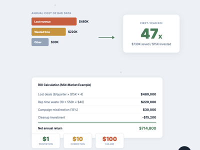 Read articleHow to calculate the ROI of CRM data cleanup: cost of bad data formula, the 1-10-100 rule, worked examples, and how to present the business case to leadership.