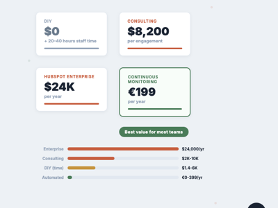 Read articleWhat a HubSpot portal audit actually costs in 2026: DIY (free but 20-40 hours), automated tools (EUR 0-399/year), and consulting ($2K-$10K+). Pricing breakdown for every approach.