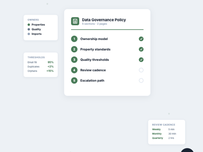 Read articleHow to build a HubSpot data governance policy that sticks: ownership model, property rules, quality standards, review cadence, and enforcement through system design.