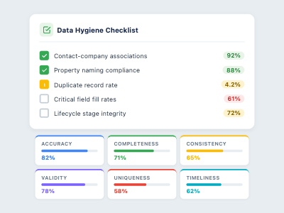 Read articleOne-page HubSpot data hygiene reference: 6 quality dimensions, object-level best practices, maturity model, 30-day quick wins, and governance playbook.