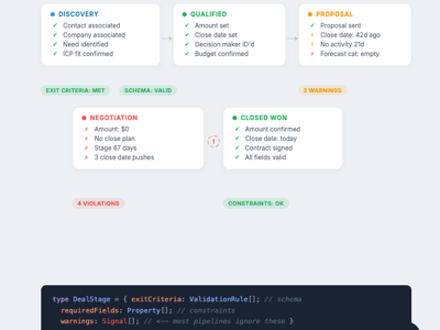 Your deal pipeline is a data structure. When stages, exit criteria, and required properties break, forecasting and AI produce garbage. Diagnose and fix it.