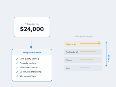 Read articleHubSpot gates portal health insights behind Enterprise ($24K/year). Get deeper diagnostics and AI readiness scoring for a fraction of the cost.