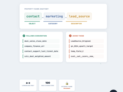 Read articleA HubSpot property naming convention framework: object_category_descriptor format, prefix rules, real examples, and how to fix badly named properties.