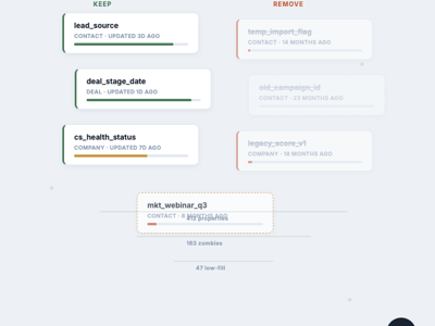 Read articleStep-by-step guide to finding unused HubSpot properties — zombie fields, low-fill properties, and orphan fields — and safely removing them without breaking workflows, reports, or integrations.