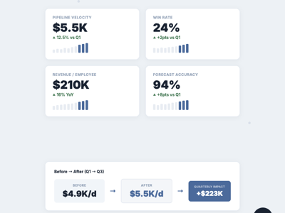 Read articleFive metrics that prove RevOps ROI to leadership: pipeline velocity, win rate, revenue per employee, time-to-revenue, and forecast accuracy.